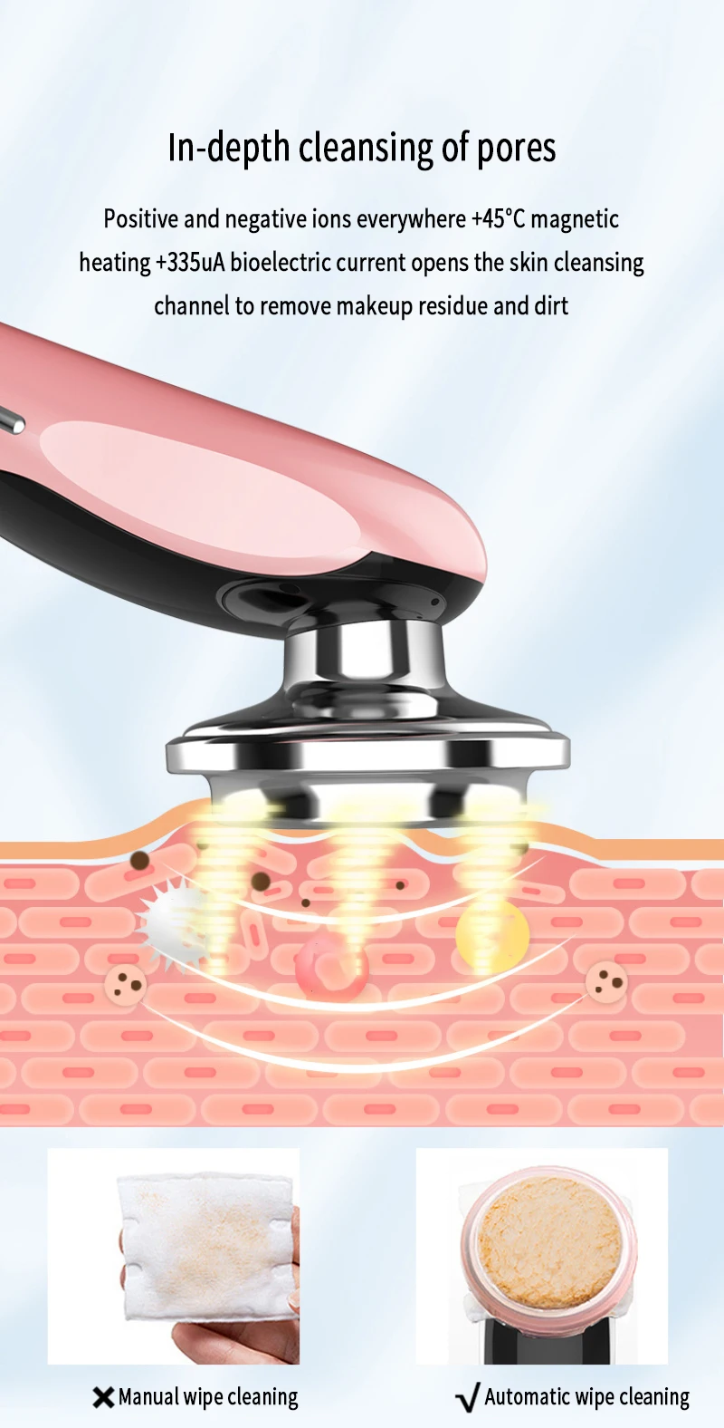 In-depth cleansing and clearing of pores, positive and negative ions open the skin cleaning channel, remove makeup residue and dirt, tighten the skin, and enhance skin elasticity.