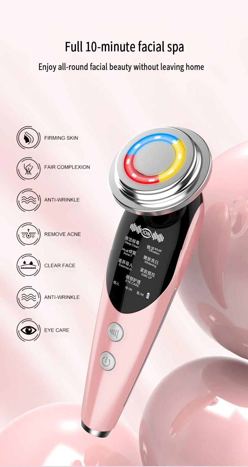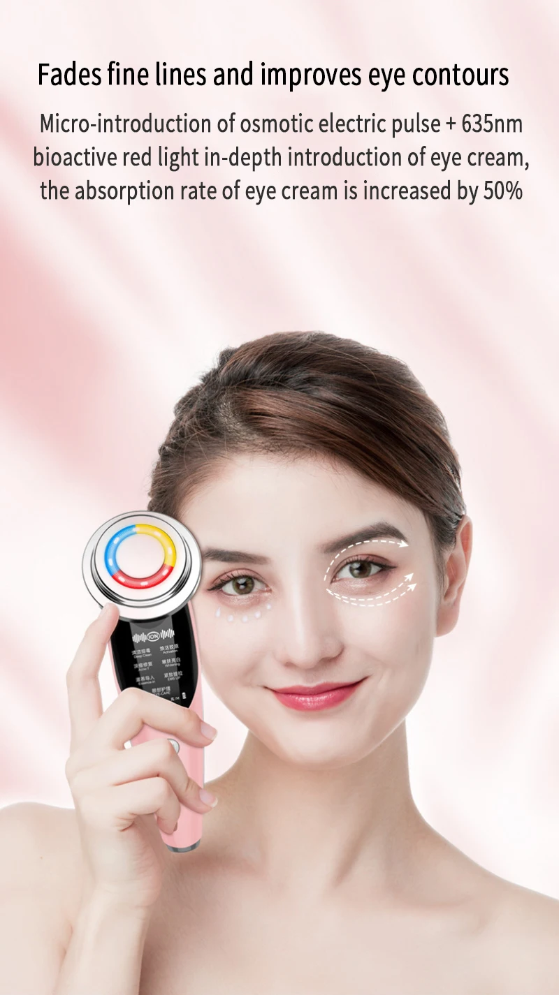 Fades fine lines, improves eye contours, micro-introduction of penetrating electric pulses, used in conjunction with skin care products, can effectively introduce nutrients into the skin, allowing the skin to fully absorb nutrients.
